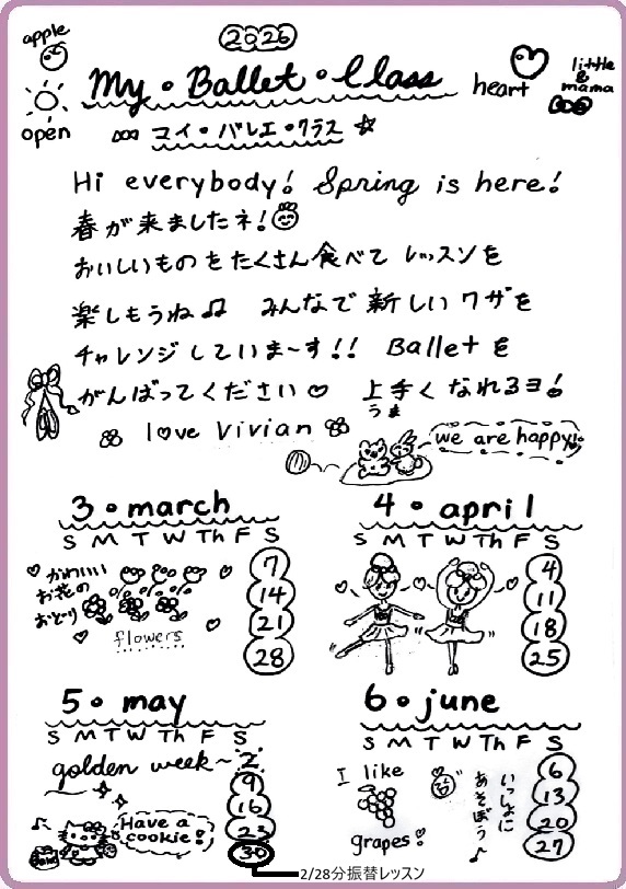 | リトル&ママクラス | ☆3歳以上対象。ママはお子さんの補助をして頂きます。 ☆少しずつバレエに親しんでいただきます。 |